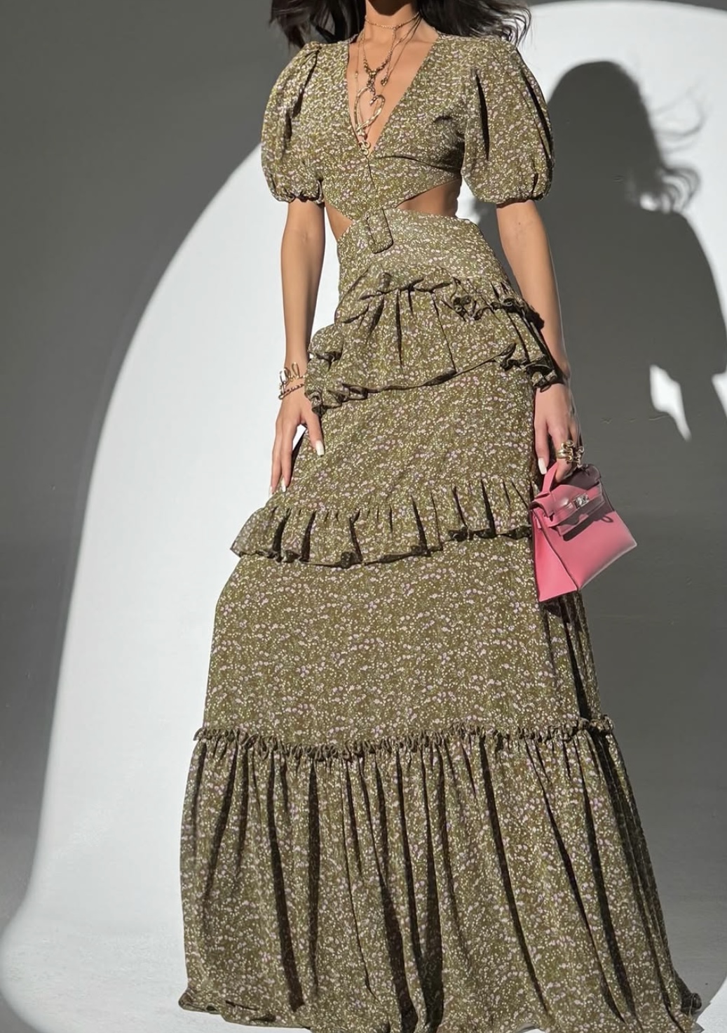 Fashion Temperament V-neck Hollow Printing Cake Dress