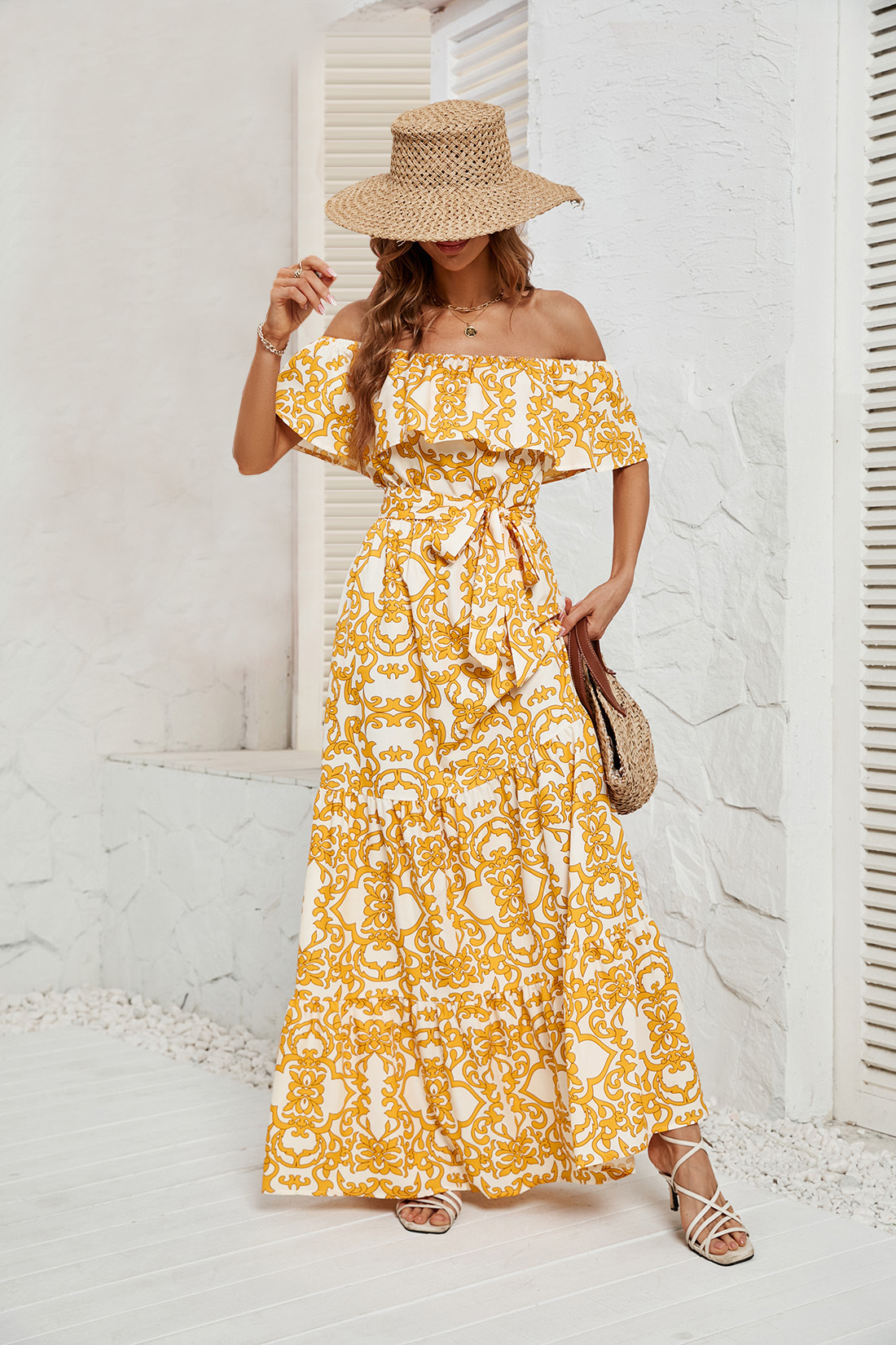 Hot Sale off-Neck Printed Ruffled Temperament Dress