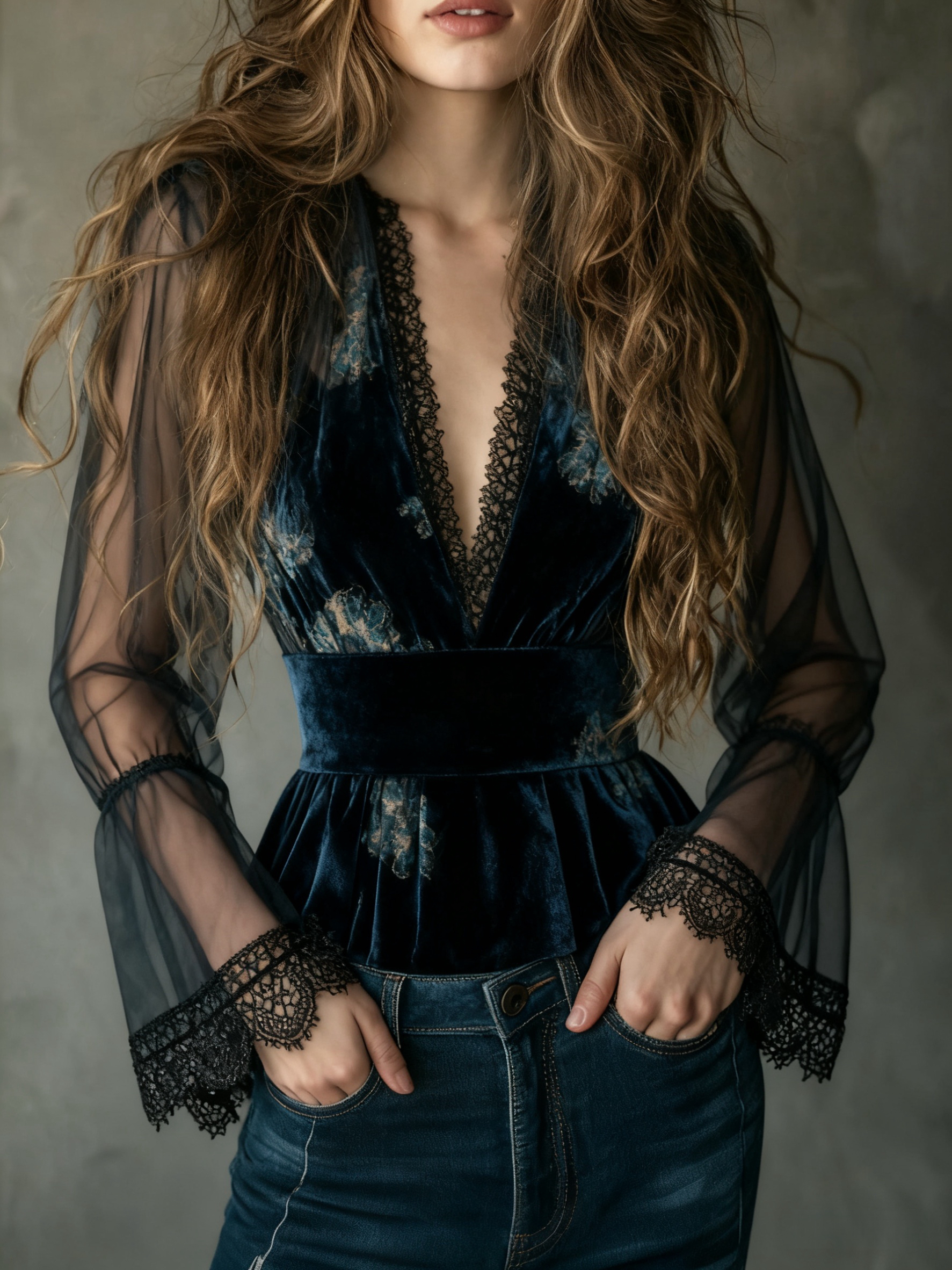 Blue velvet floral chiffon top